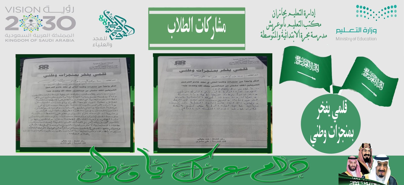 الوطن كلمة بسيطة وحروفها قليلة ولكن ها تحمل معاني عظيمة وكثيرة نعجز عن حصرها فهو هويتنا التي نحملها ونفتخر بها وهو المكان الذي نلجأ له ونحس بالأمان هو الحضن الدافئ الذي يجمعنا معنا وهو نعمة من الله أنعمها علينا فيجب علينا أن نحميه وندافع عنه. قلمي يحكي عن منجزات وطني. وهي ذكرى جميلة لا تنسى. عدم التحاق ذوي الإعاقة بمراكز الرعاية لن يؤثر على قبولهم في العام المقبل.